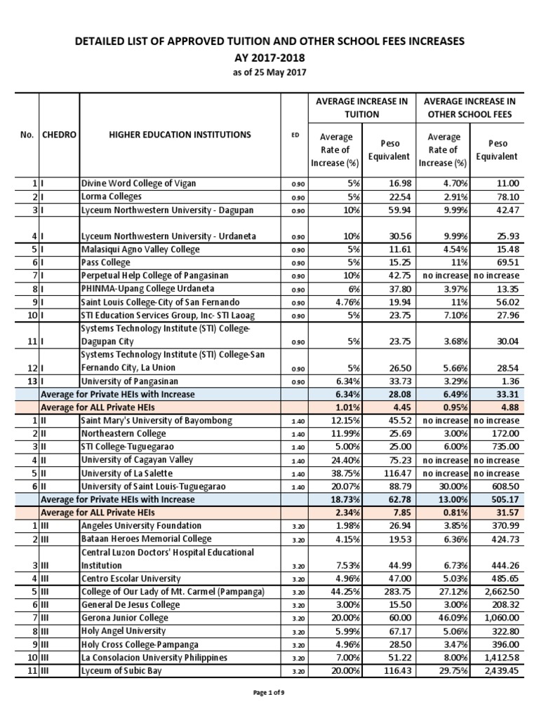 Detailed List Of Approved Tuition And Other School Fees Increases Ay 2017 2018 As Of 25 May 2017 Pdf